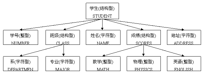 设一个学生记录为一个结构,内由学号、班级、姓名、宿舍、成绩等有关信息组成,它们分别为不同类型。有些成员下还可再由若干数据组成,如图71所示。边注的英文名是程序中所取的该成员的名称。在程序中,如要访问整个学生结构,只要在被访问处写上结构名,即写上STUDENT。访问其中成员,如成员是一个简单数据,例如学生姓名,则在程序中被访问处写上STUDENT%NAME即可。访问成员中结构成员下的简单数据,则用两个%表示。如访问学生所在系,则在被访问处写STUDENT%CLASS%DEPARTMENT。第2个百分号表示DEPARTMENT是CLASS的成员。如果DEPARTMENT下面还有成员,要访问这些成员时后面还需加上‘%成员名’。